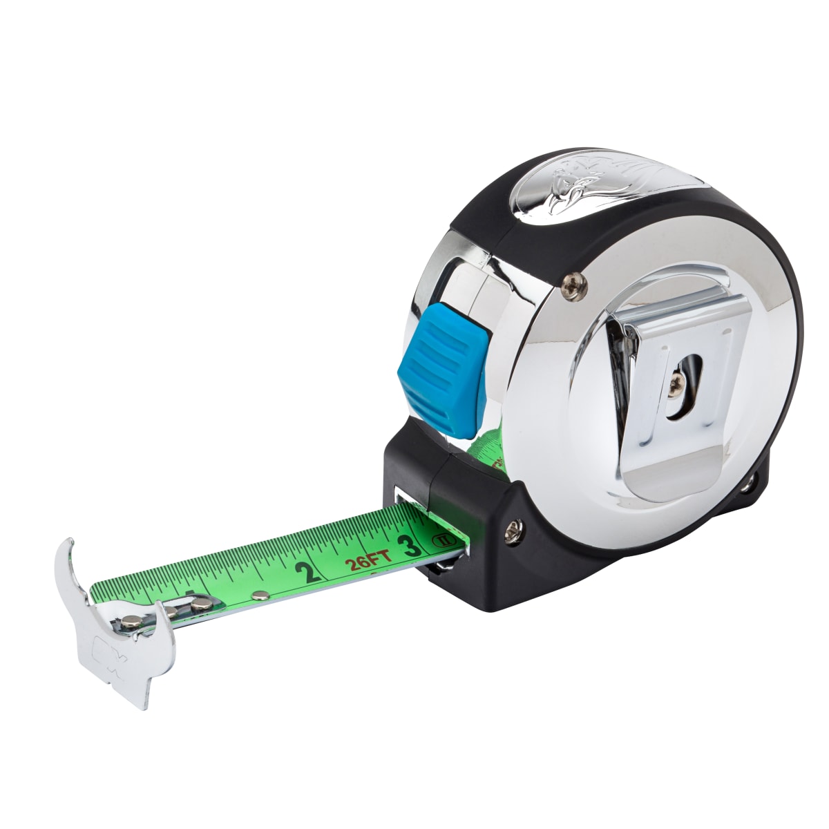 OX Pro 8m Tape Measure 8m (26ft) features a chrome case with over mould for heavy duty use. The cushioned grip provides comfort with a slip resistant hold. It also has an extra tough nylon coated steel 27mm wide blade and it has a 2.8m stand out. The big end hook has an easy access thumb lock.