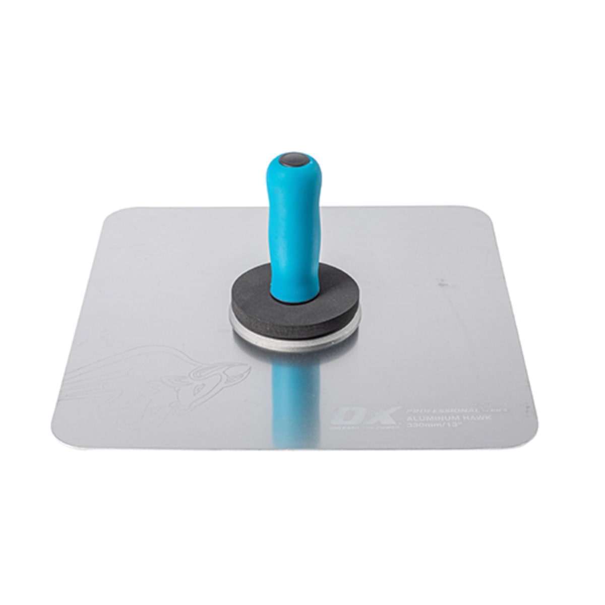 Ox Pro aluminium hawk 330 x 330mm engineered for holding plaster or mortar ready for application. Manufactured from heavy gauge hard-rolled aluminium delivering strength and rigidity.