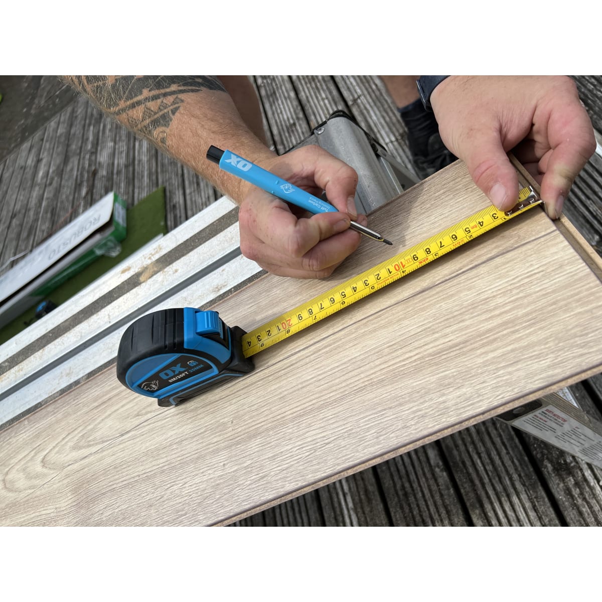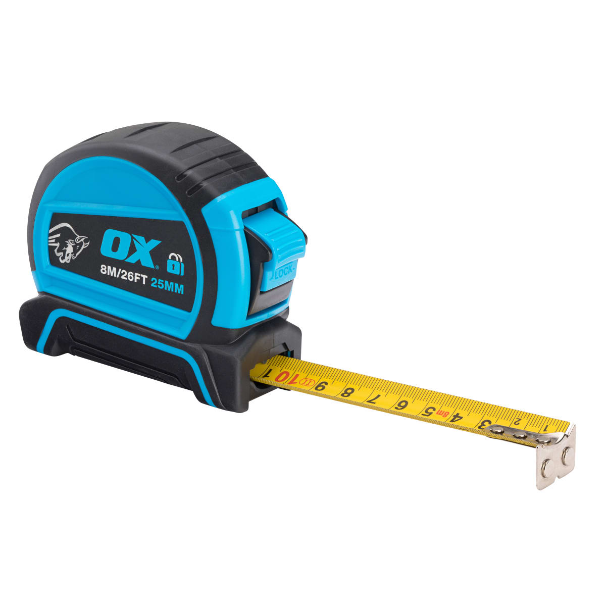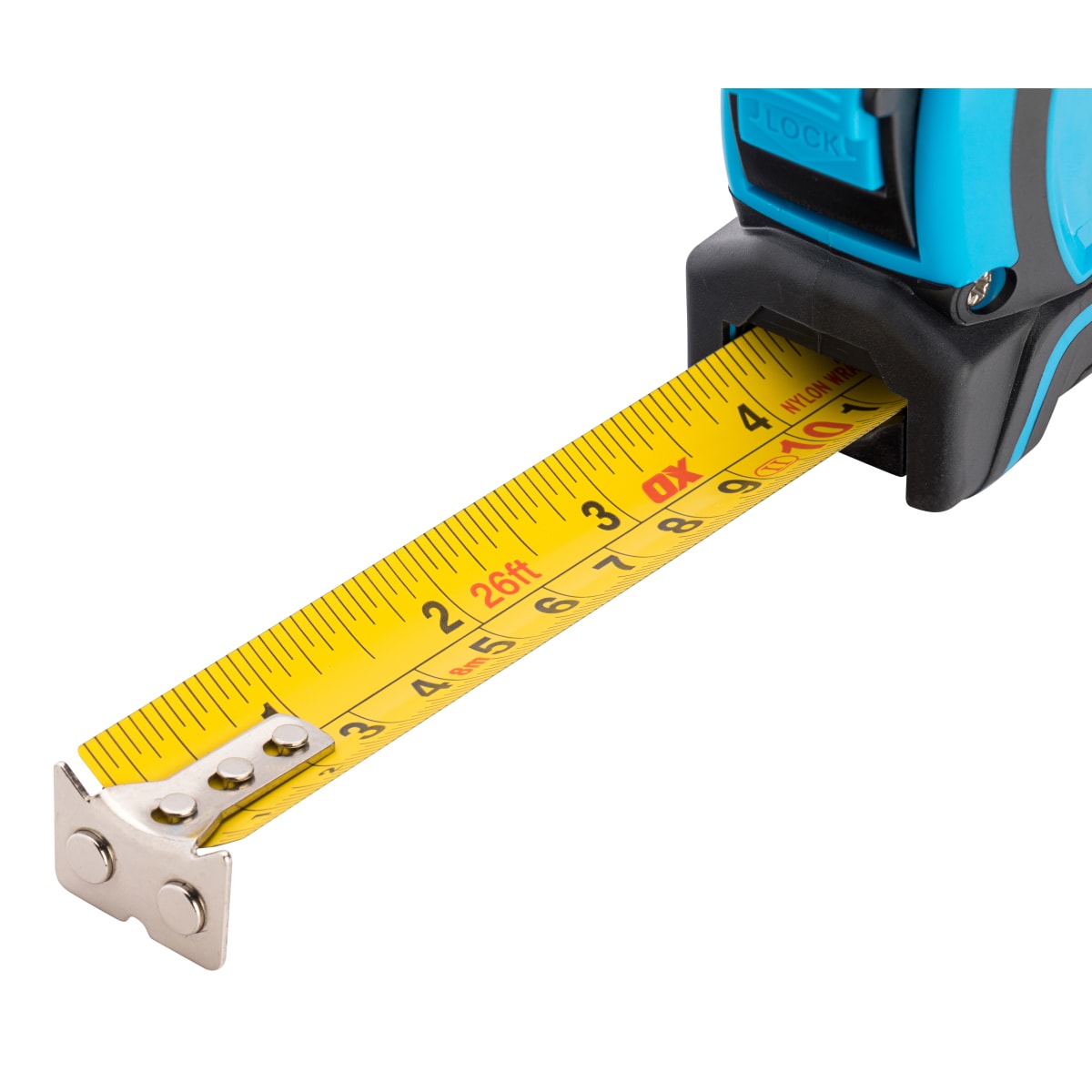 OX Pro Dual Auto Lock Tape Twin Pack 8m (26ft) has double-sided tape measurements with a patented dual locking mechanism. The casing is made of robust rubber that withstands knocks and drops. It has a super compact ergonomic shell with a handy belt clip to attach to a tool belt. It also features an extruded nylon blade for longer life and greater standout.