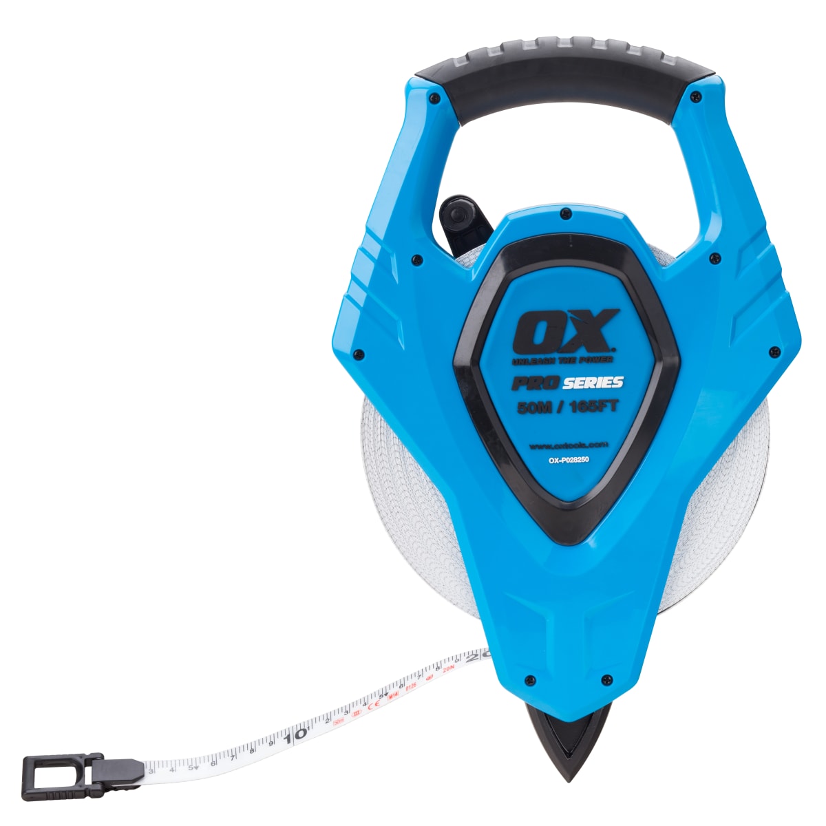 OX Pro Fibreglass Open Reel Tape 50m (165ft) features an ergonomic soft grip handle and a heavy duty casing. It also has a double nylon coated fibreglass blade.