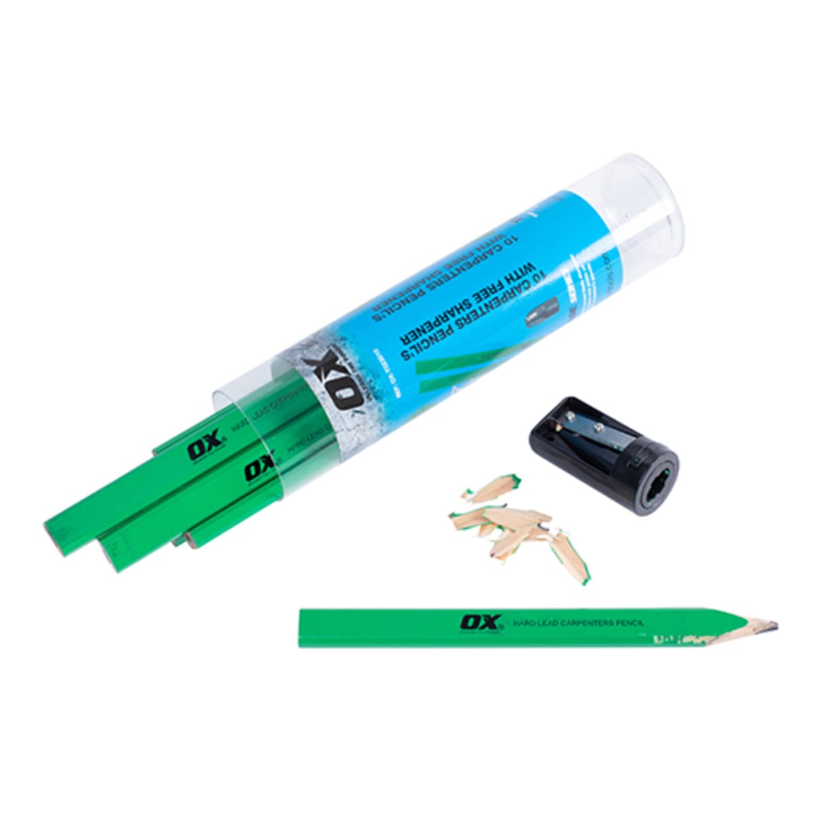 Ox Trade pack of 10 carpenters pencils with hard lead. The chamfered rectangle shape prevents the pencil from rolling away and has the added benefit of offering extra grip. To help make legible lines use a straight edge for better visibility.