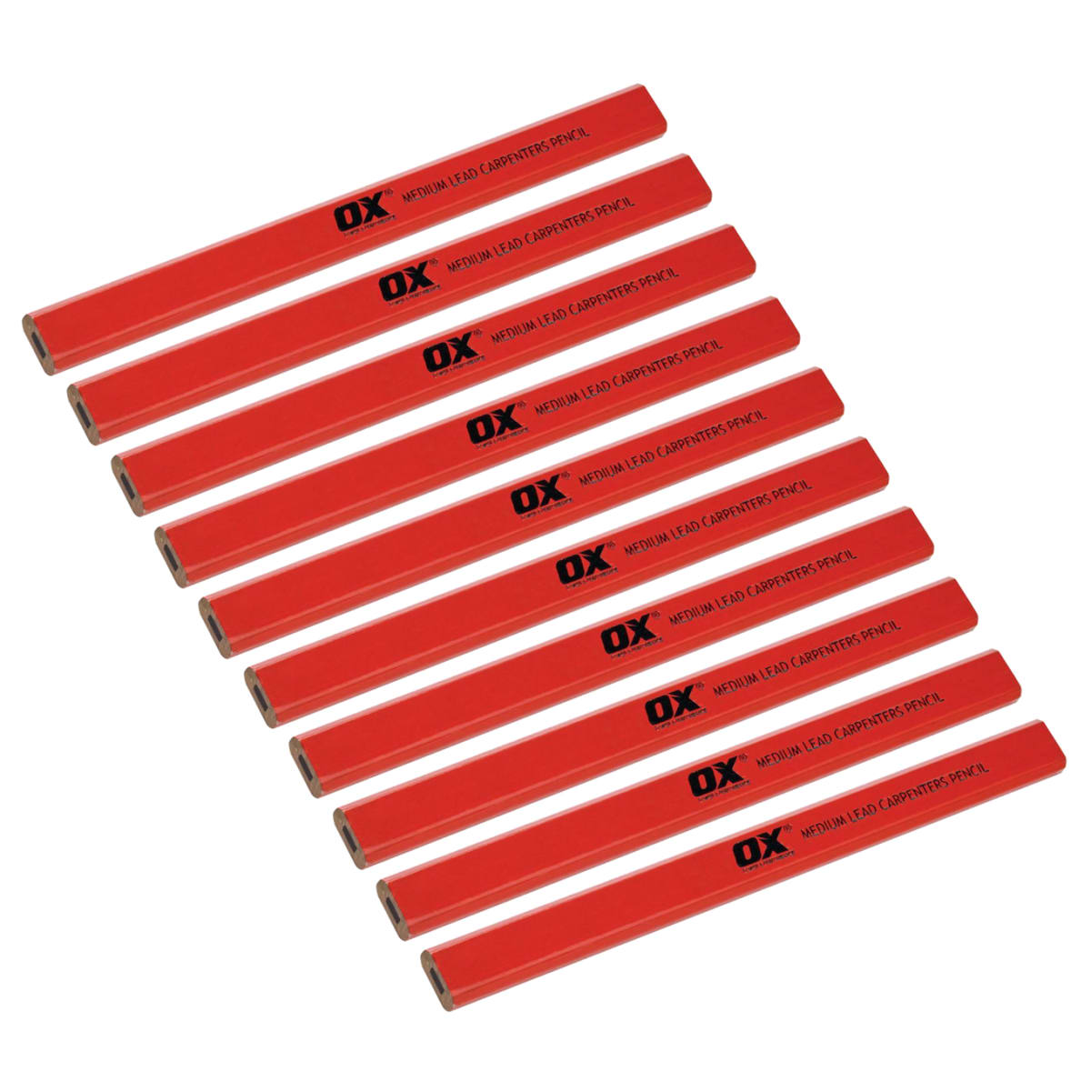 Ox Trade pack of 10 carpenter's pencils. The chamfered rectangle shape prevents the pencil from rolling away and has the added benefit of offering extra grip. To help make legible lines use a straight edge for better visibility.
