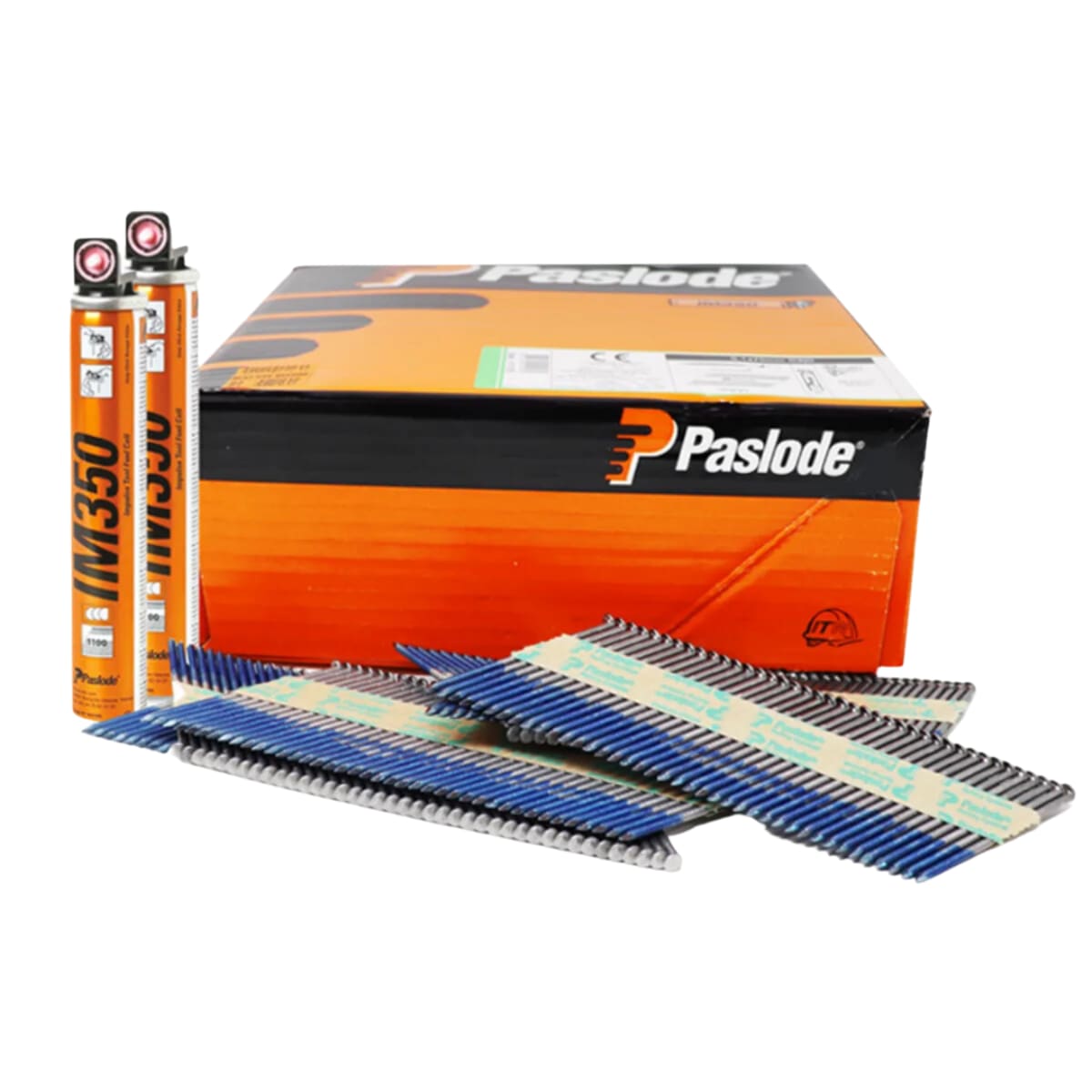 A Paslode 90 x 3.1mm Bright Nail Fuel Pack for use with the Paslode IM350+ Framing Nailer. This pack contains 2200 90 x 3.1mm Bright Wire smooth nails and two fuel cells.