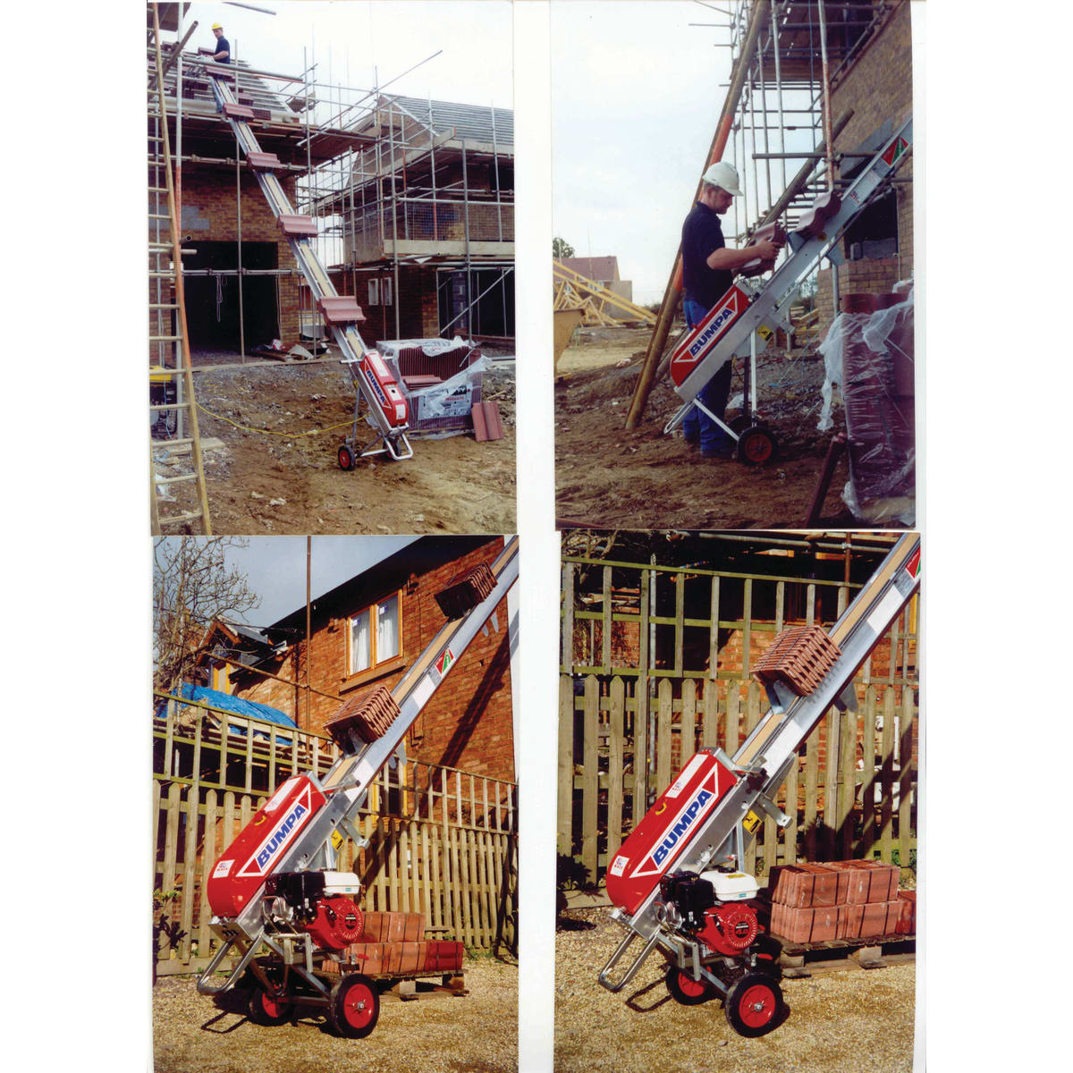 Loads tiles, fittings, felt, bricks, blocks, mortars etc. Quick to erect and easily repositioned by two men, even on difficult sites. Continuous action. Powered reverse for stripping salvage.