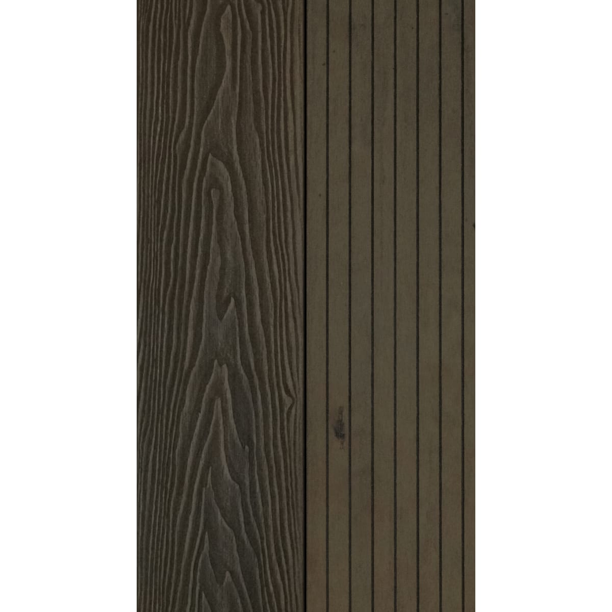 This composite decking product has a woodgrain effect pattern on one side and a colour matching traditional grooved finish on the reverse.