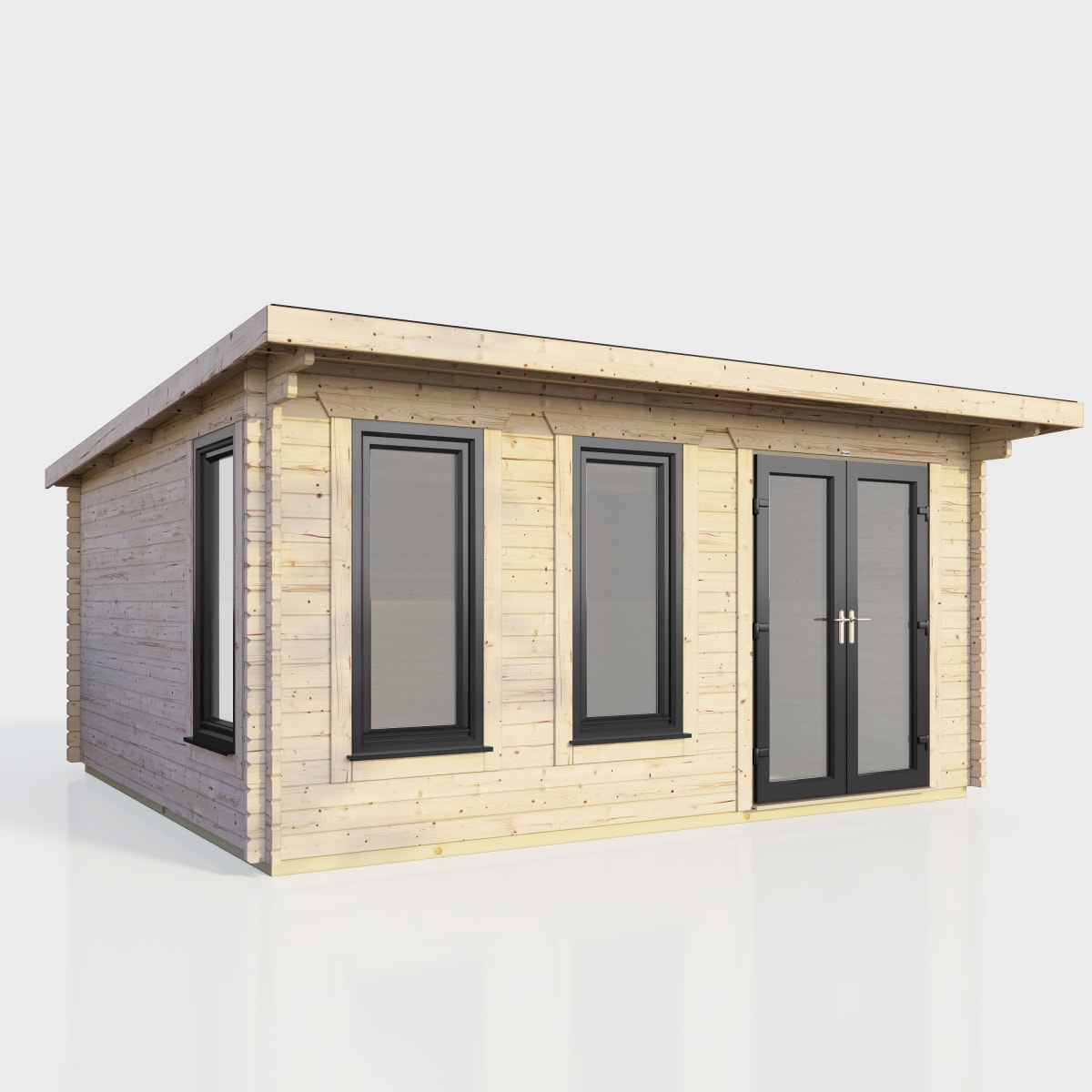 Our 44mm log cabins feature uPVC Double Doors and 'Tilt and Turn' Opening Windows in Anthracite Grey, offering security and insulation with toughened double glazing and a 5-point locking mechanism. the roof has a 50-year life expectancy with an EPDM rubber roofing system and gutter edge drip plate. the cabin is under 2.5m in height, bypassing most planning permission restrictions, and constructed with 44mm thick high-grade Timber walls. the y also include contemporary touches such as 'easy access' aluminium low threshold sills on the doors and Burford style skirting, innovative self-assembly, sustainable timber sourcing, and kerbside delivery with advanced booking.