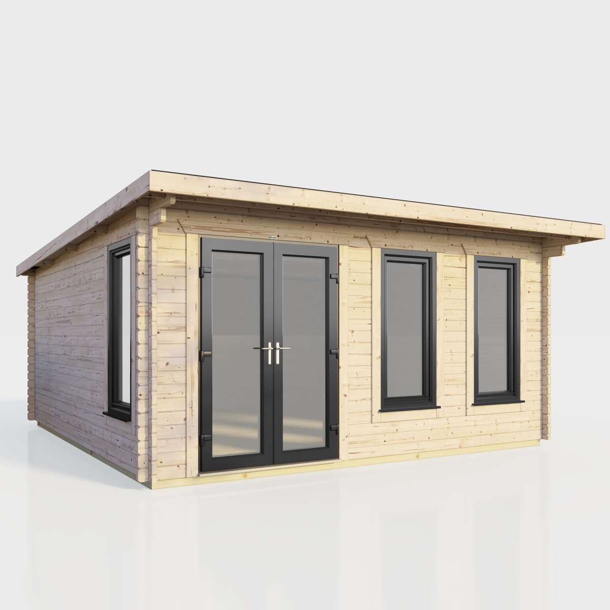 Our 44mm log cabins feature uPVC Double Doors and 'Tilt and Turn' Opening Windows in Anthracite Grey, offering security and insulation with toughened double glazing and a 5-point locking mechanism. the roof has a 50-year life expectancy with an EPDM rubber roofing system and gutter edge drip plate. the cabin is under 2.5m in height, bypassing most planning permission restrictions, and constructed with 44mm thick high-grade Timber walls. the y also include contemporary touches such as 'easy access' aluminium low threshold sills on the doors and Burford style skirting, innovative self-assembly, sustainable timber sourcing, and kerbside delivery with advanced booking.