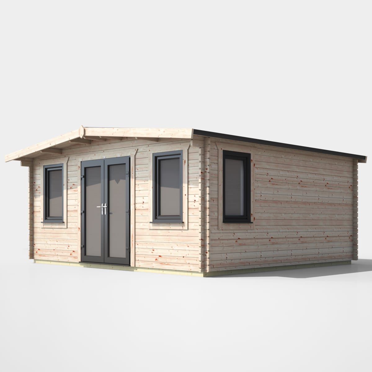 - Each log cabin uses uPVC Double Doors in Anthracite Grey and uPVC 'Tilt and Turn' Opening Windows. All glass is both toughened and double glazed.