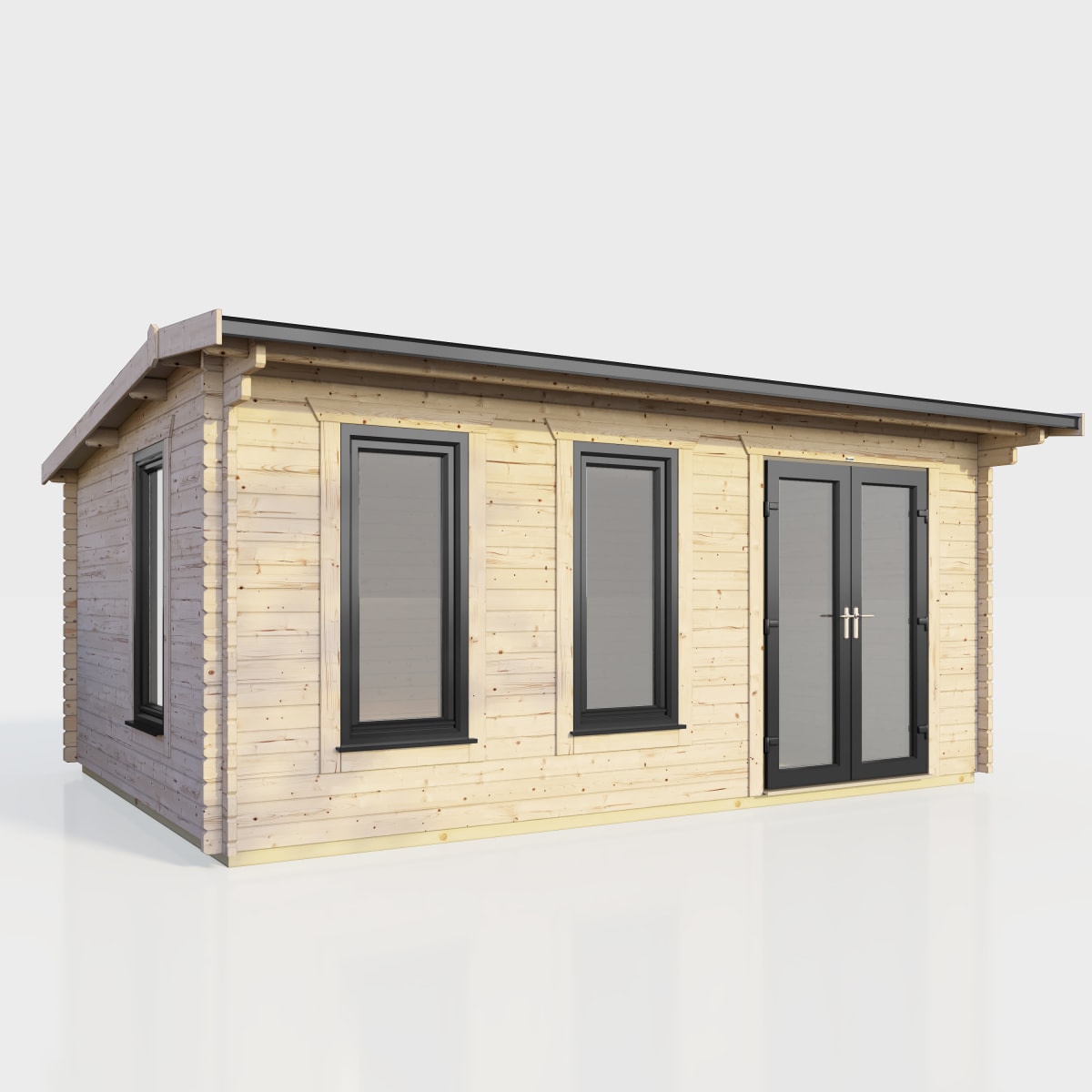 - Each log cabin uses uPVC Double Doors in Anthracite Grey and uPVC 'Tilt and Turn' Opening Windows. All glass is both toughened and double glazed.