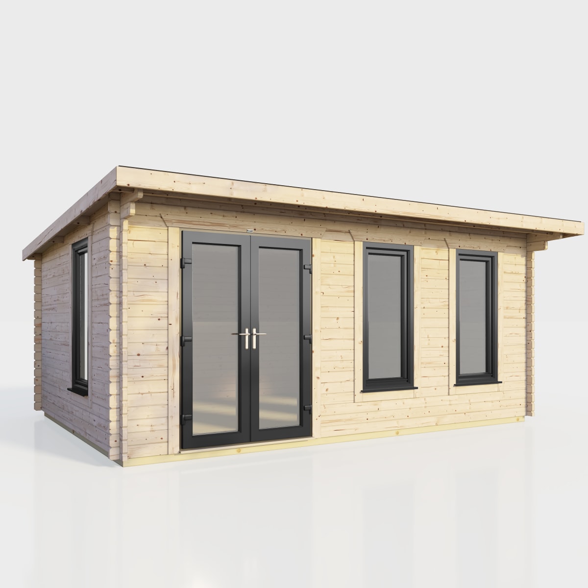 - Each log cabin uses uPVC Double Doors in Anthracite Grey and uPVC 'Tilt and Turn' Opening Windows. All glass is both toughened and double glazed.