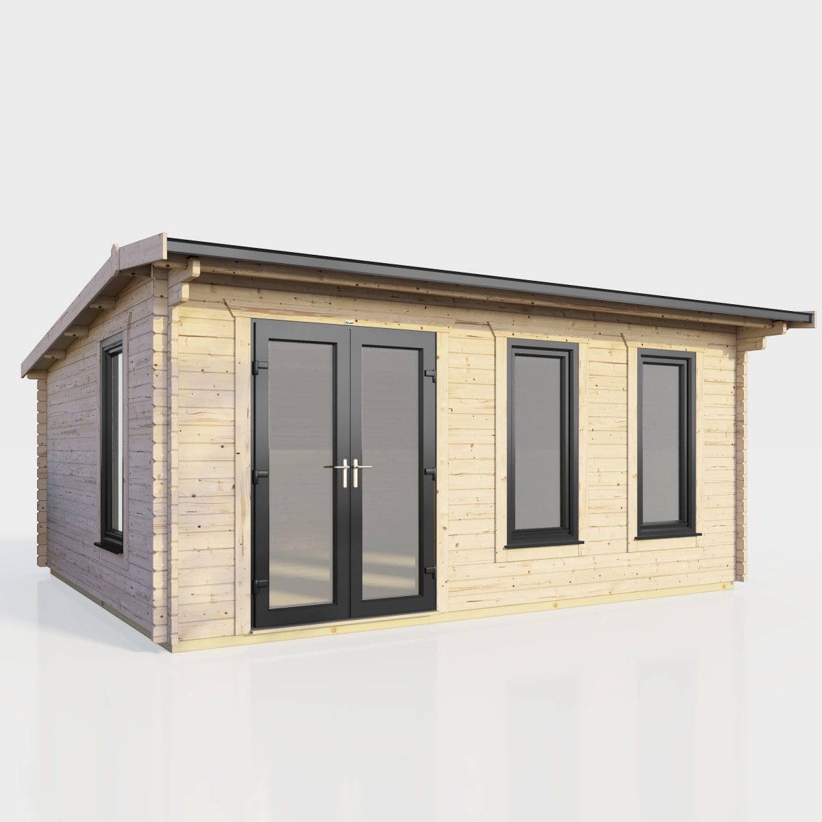 Our 44mm log cabins feature uPVC Double Doors and 'Tilt and Turn' Opening Windows in Anthracite Grey, offering security and insulation with toughened double glazing and a 5-point locking mechanism. the roof has a 50-year life expectancy with an EPDM rubber roofing system and gutter edge drip plate. the cabin is under 2.5m in height, bypassing most planning permission restrictions, and constructed with 44mm thick high-grade Timber walls. the y also include contemporary touches such as 'easy access' aluminium low threshold sills on the doors and Burford style skirting, innovative self-assembly, sustainable timber sourcing, and kerbside delivery with advanced booking.