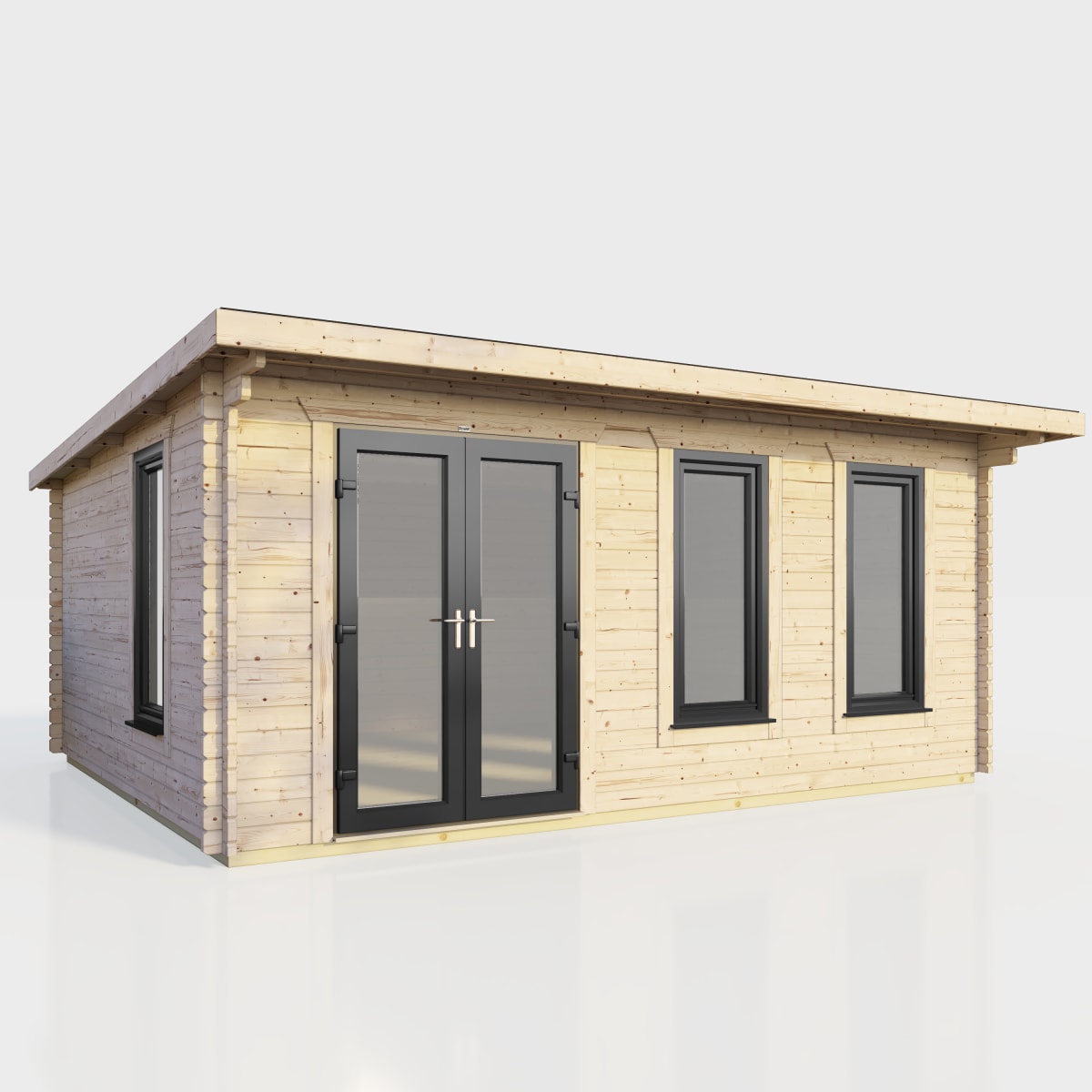 Our 44mm log cabins feature uPVC Double Doors and 'Tilt and Turn' Opening Windows in Anthracite Grey, offering security and insulation with toughened double glazing and a 5-point locking mechanism. the roof has a 50-year life expectancy with an EPDM rubber roofing system and gutter edge drip plate. the cabin is under 2.5m in height, bypassing most planning permission restrictions, and constructed with 44mm thick high-grade Timber walls. the y also include contemporary touches such as 'easy access' aluminium low threshold sills on the doors and Burford style skirting, innovative self-assembly, sustainable timber sourcing, and kerbside delivery with advanced booking.