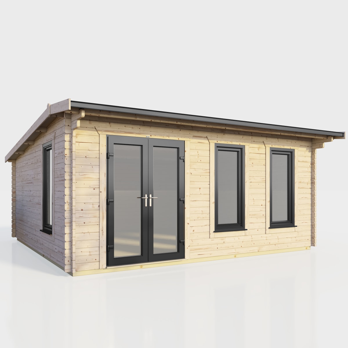 Our 44mm log cabins feature uPVC Double Doors and 'Tilt and Turn' Opening Windows in Anthracite Grey, offering security and insulation with toughened double glazing and a 5-point locking mechanism. the roof has a 50-year life expectancy with an EPDM rubber roofing system and gutter edge drip plate. the cabin is under 2.5m in height, bypassing most planning permission restrictions, and constructed with 44mm thick high-grade Timber walls. the y also include contemporary touches such as 'easy access' aluminium low threshold sills on the doors and Burford style skirting, innovative self-assembly, sustainable timber sourcing, and kerbside delivery with advanced booking.