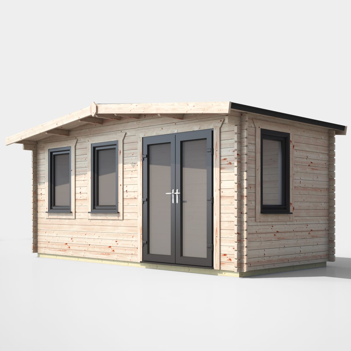 Our 44mm log cabins feature uPVC Double Doors and 'Tilt and Turn' Opening Windows in Anthracite Grey, offering security and insulation with toughened double glazing and a 5-point locking mechanism. the roof has a 50-year life expectancy with an EPDM rubber roofing system and gutter edge drip plate. the cabin is under 2.5m in height, bypassing most planning permission restrictions, and constructed with 44mm thick high-grade Timber walls. the y also include contemporary touches such as 'easy access' aluminium low threshold sills on the doors and Burford style skirting, innovative self-assembly, sustainable timber sourcing, and kerbside delivery with advanced booking.