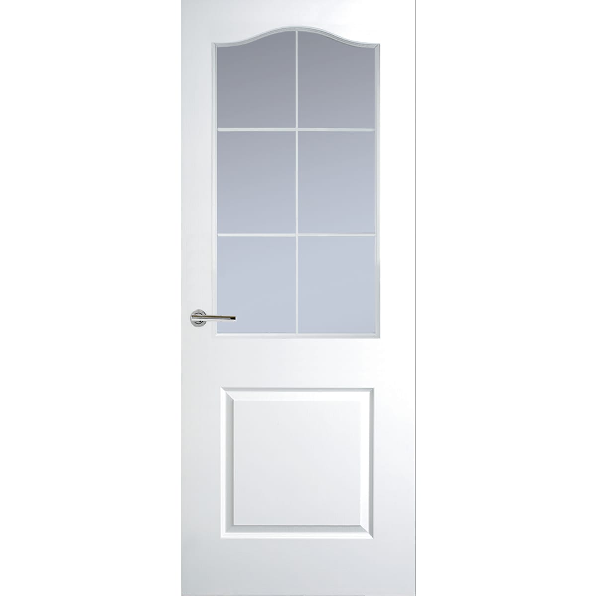 Quality white base coated moulded panel facings with textured faces suitable for on-site painting. Clear single pane glazing with paper wrapped MDF or timber glazing cassette at our option, glazing bar effect created using white effect decorative leading. Clear glass toughened to BS EN 12600 with alternative door styles available. Handles for illustration purposes only.