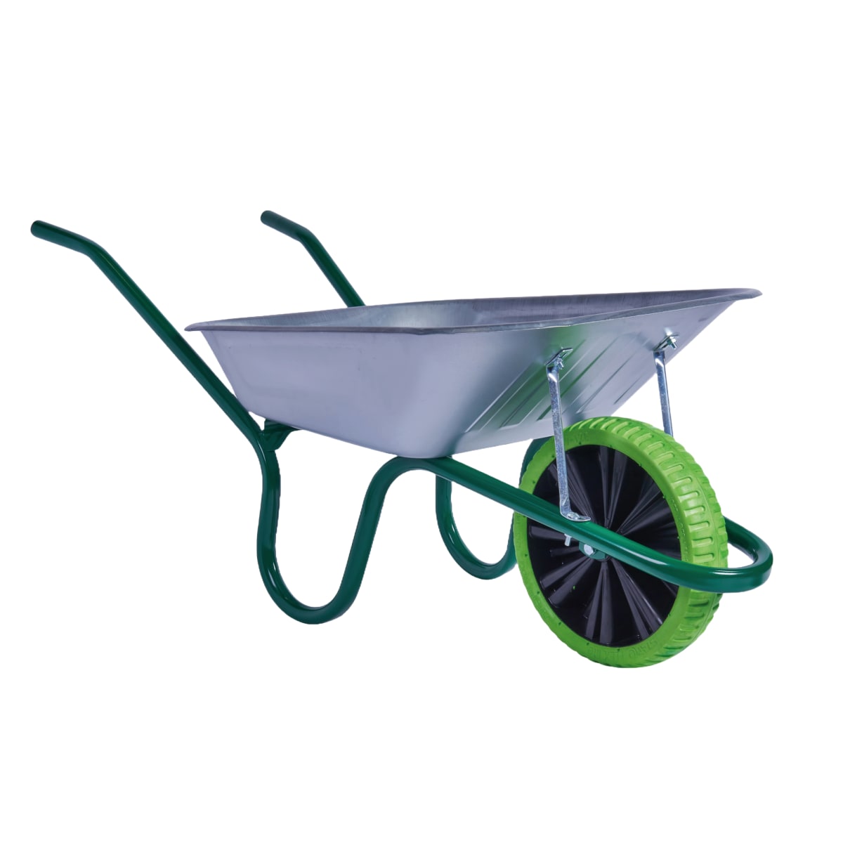 A heavy duty wheelbarrow with a 90 litre galvanised steel tray. Fitted with an epoxy coated tubular steel frame with a solid front tipping bar for easier unloading. The puncture free wheel is attached to a heavy duty hub delivering the low maintenance of a solid wheel whilst providing easy manoeuvrability across all terrains even when the wheelbarrow is fully loaded. Engineered for professional use, making it ideal for all building trades and landscape gardeners.
