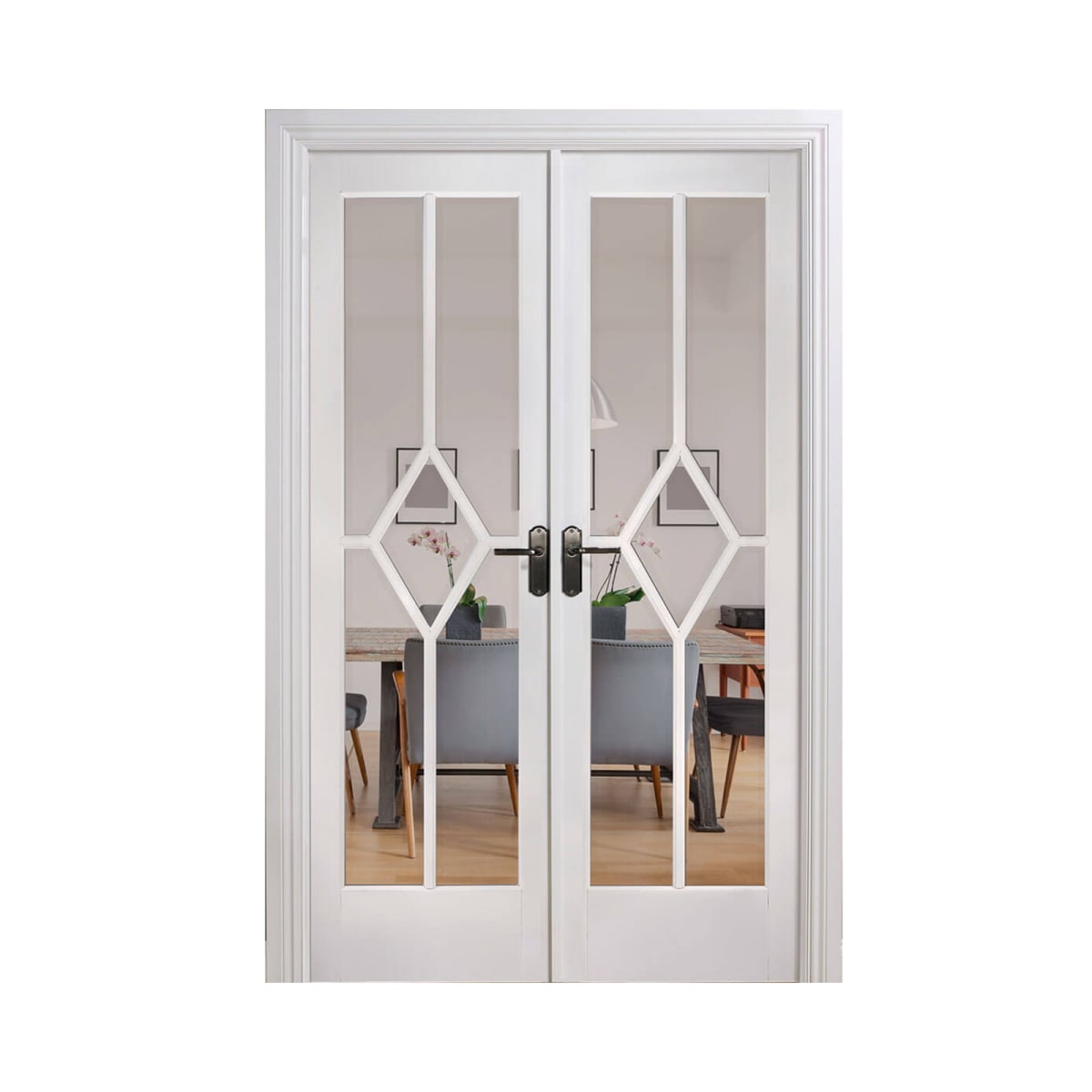 A unique diamond design created from decorative beading is placed on clear bevelled glazing, forming a traditional, sophisticated room divider.