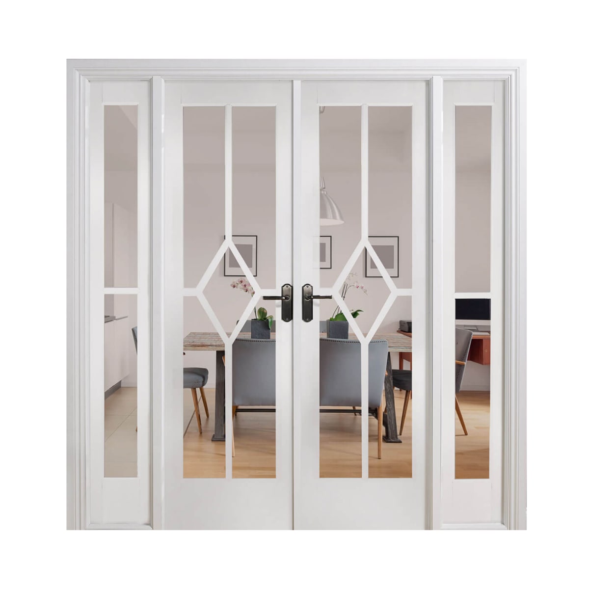 A unique diamond design created from decorative beading is placed on clear bevelled glazing, with two added demi panels either side forming a traditional, sophisticated room divider.