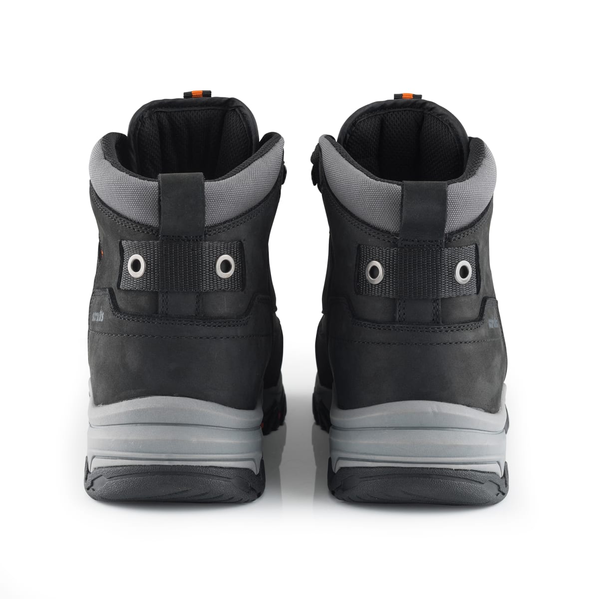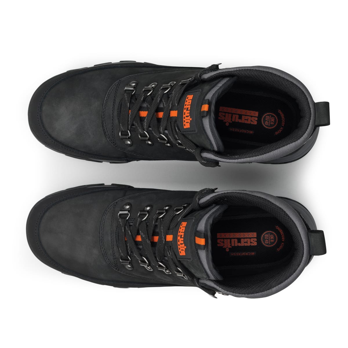 Scruffs Scarfell Safety Boots Black are mid-ankle, full-grain nubuck leather boots with steel toe and midplate for protection. Antistatic, shock absorbent, slip resistant, S1P SR rated.