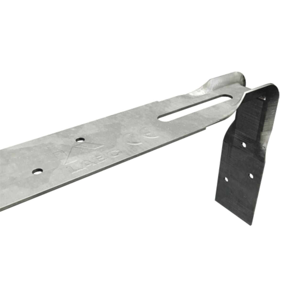 The Simpson Strong-Tie Light Engineered Restraint Strap which measures 600 x 1.5mm (L x T) is made from pre-galvanised steel. The material is known for its formability and resistance to corrosion hence austenitic steels are the most widely used grade of stainless steel. This is a direct replacement for traditional 2.5mm thick restraint straps as the innovative design of these lightweight straps allows ease of handling and installation whilst maintaining the structural strength and robustness of much heavier weight types. The LES (light engineered strap) replaces traditional light restraint straps in roof construction. The LES straps are less than 40% of the weight, quicker to fit, and overcome many fixing problems associated with traditional heavy straps. The LES is designed for vertical applications with the bend at 100mm.