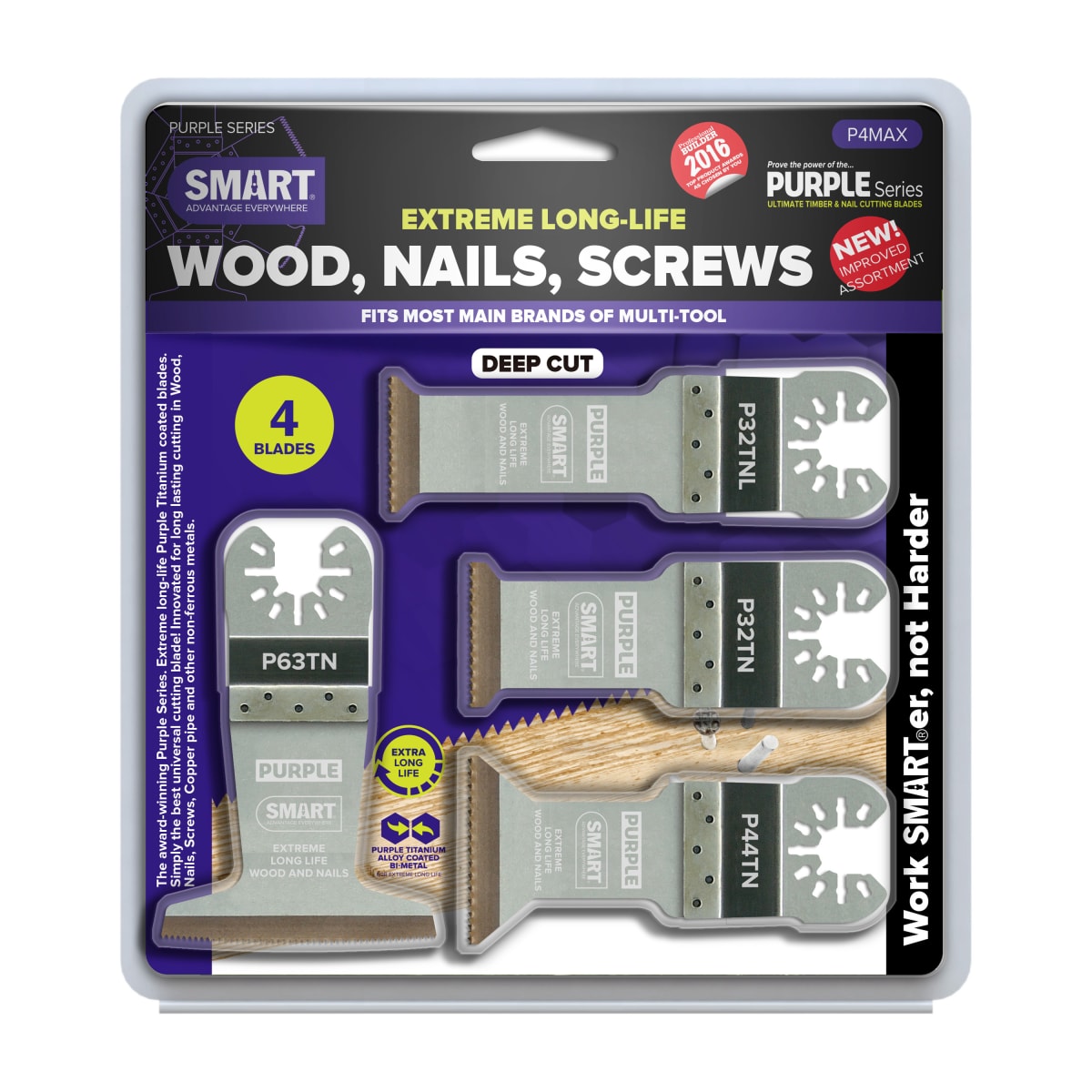 The SMART Purple Series 4 Piece Titanium Alloy Bi-Metal Blade Set Chrome is manufactured from quality material to provide all round, long- life cut. The blades have varying widths such as 32mm, 44mm, 63mm, 90mm with a depth of cut ranging between 18-52mm. The titanium reduces the heat build-up and protects the blade when cutting through nails, copper pipes, even screws. This feature ensures that the cut is clean and that the blade does not heat up making this blade the best blade solution. The SMART series of multi-tool product are at the apex of the quality spectrum. All of the products are made from the highest quality materials and are subjected to face numerous quality and rigor tests.
