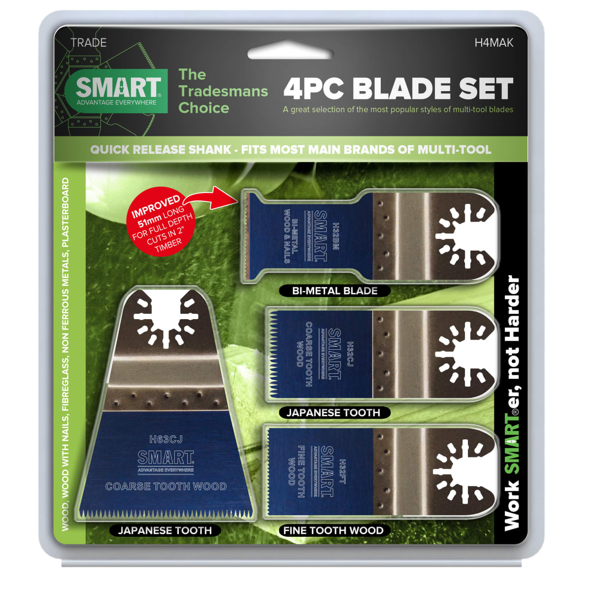 The SMART Trade 4 Piece Multi Tool Blade Set consists of a 32mm W fine tooth wood blade, 32mm W Japanese precision tooth wood blade, 63mm W Japanese precision tooth wood blade and a 32mm W bi-metal wood and nails blade. These blades are advantageous in use for cutting wood, plastic, wood with nails and non-ferrous metals. All of the blades have a depth of cut of 42mm. Both of the Japanese precision tooth wood blade are for coarse fast cutting while the bi-metal is suited for cutting timber and nails. The SMART series of multi-tool blades are at the apex of the quality spectrum. All of the blades are made from the highest quality materials and are subjected to face numerous quality and rigor tests.