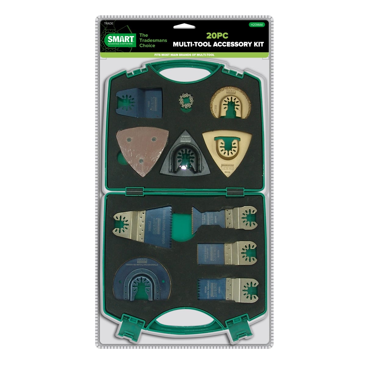 Unlock the full potential of your multi-tool with this SMART Trade Series 20 Piece Accessory Kit . The all-encompassing multi-tool accessory kit from the Trade Series is a perfect introductory selection of twenty accessories covering almost every use of the multi-tool. Suitable for sanding, scraping, grout removal, cutting wood, hardwood, plastic, non-ferrous metal and nails. The Trade Series contains a huge range of high-quality multi-tool blades and accessories designed to equip trade users with an accessory for any and all requirements. Extend the capability of your multi-tool with the wide range of cutting, scraping, sanding and grinding accessories in the Trade Series.
