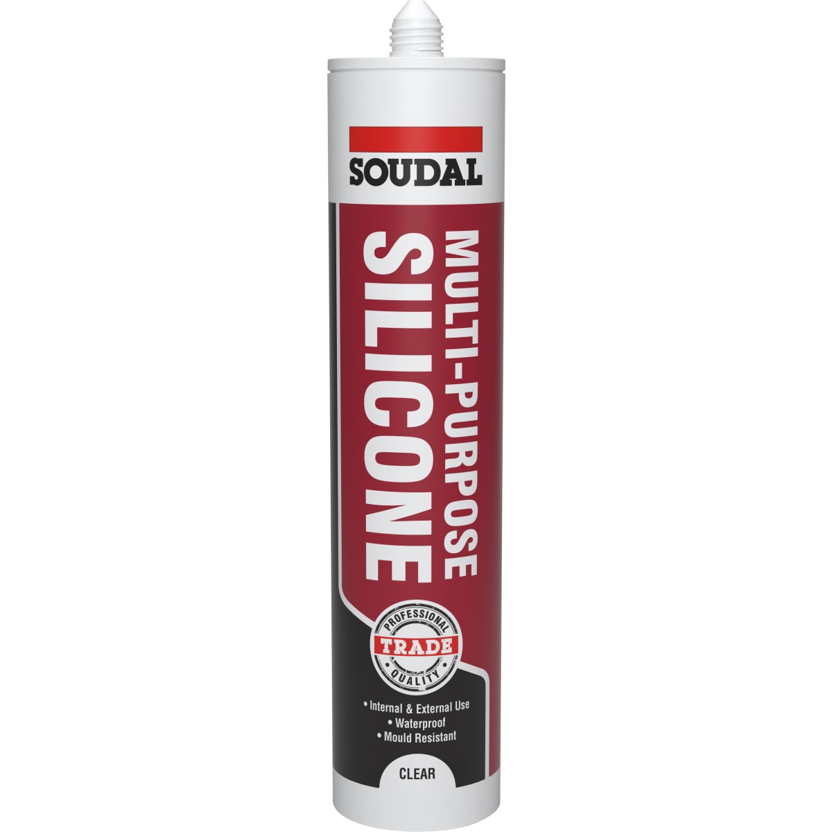Soudal Multi Purpose Silicone. Acetoxy silicone sealant that cures to form a flexible, durable weathertight seal on many common building surfaces, including glass, metals, wood and ceramic tiles. Contains a fungicide that resists mould growth. Suitable for interior and exterior use.