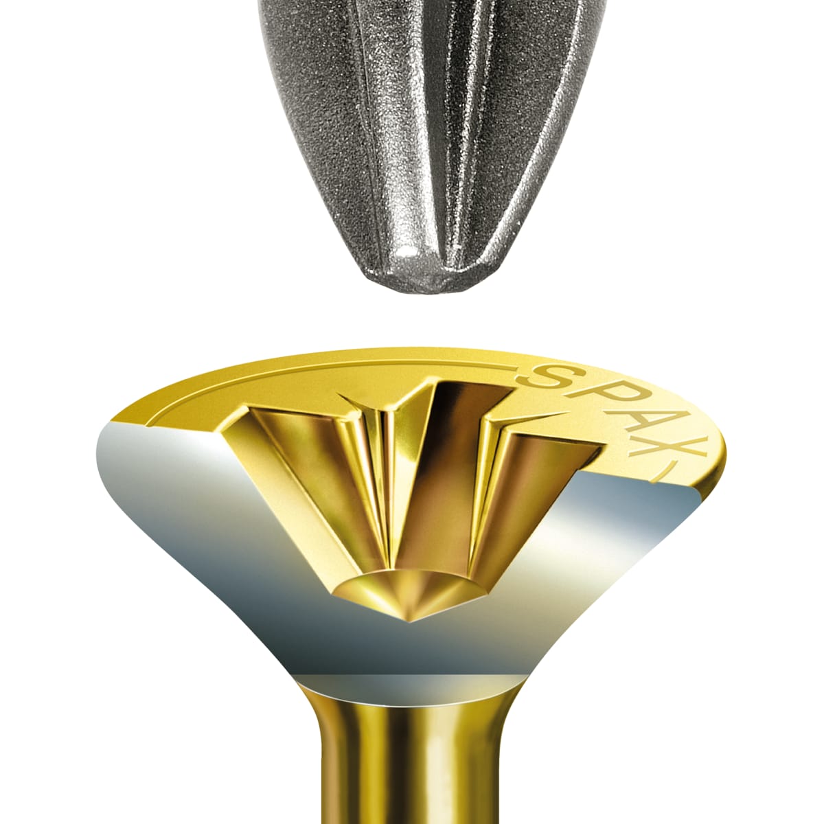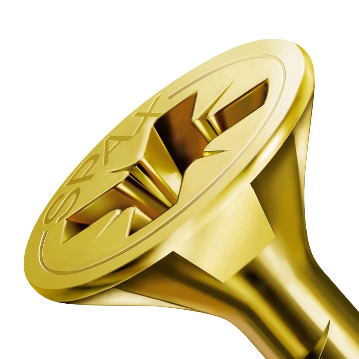 SPAX 5.0 x 100mm universal use woodscrews recommended for indoor projects. 100 screws in the pack. YELLOX coated - achieves greater corrosion protection compared to blue zinc plating. No pre-drilling required (wood dependant). 4CUT point ensures exact screw positioning, reduces splitting, reduces the screwing-in torque required to fix. Countersinks easily. Mills into the wood - stops on metal! Quick & secure fastening with the PZ2 driver bit recess.