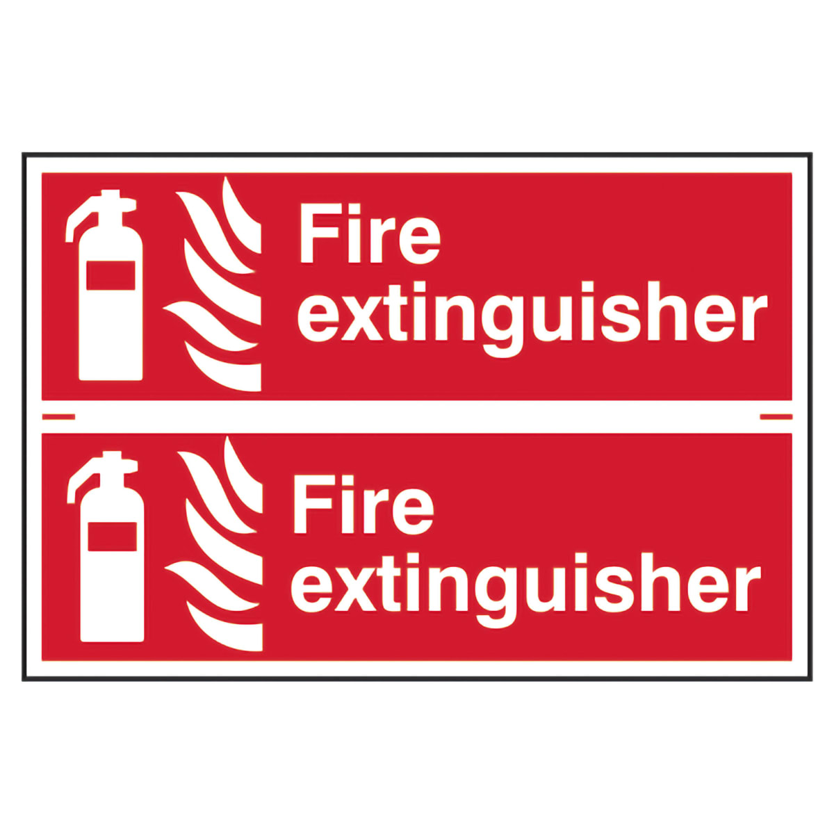 Fire Extinguisher' is a 300mm x 100mm fire safety sign. This sign comes with two single signs (300mm x 100mm) on one sheet with guide lines to cut into individual signage. Each sign is self-adhesive semi-rigid PVC making it easy to apply to a clean dry surface.