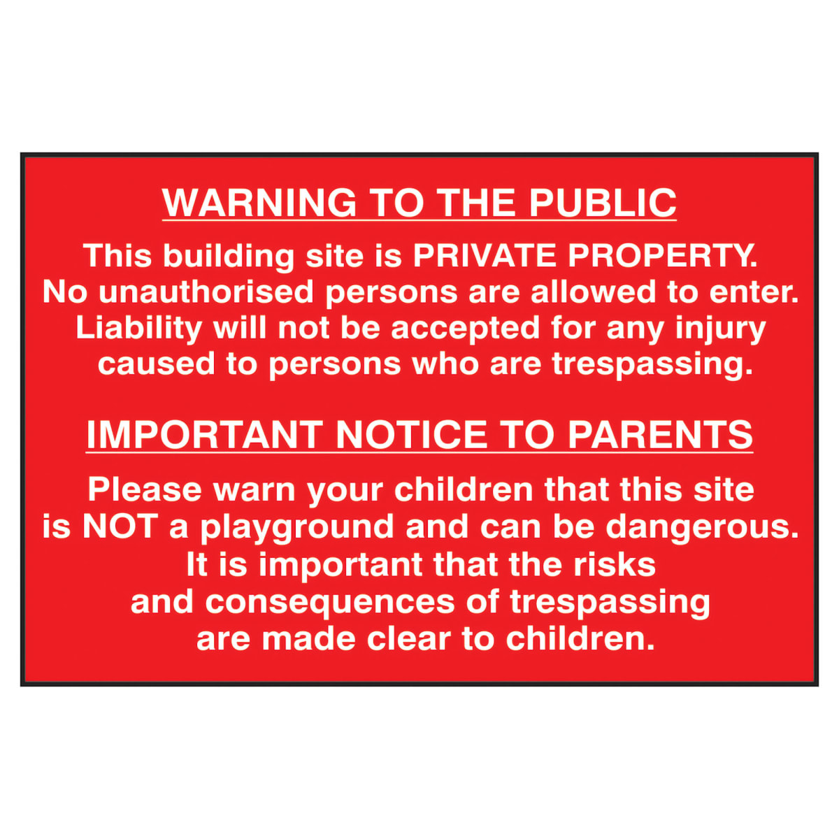 | Product Name | Building Site Warning To Public And Parents' Sign 600mm x 400mm |