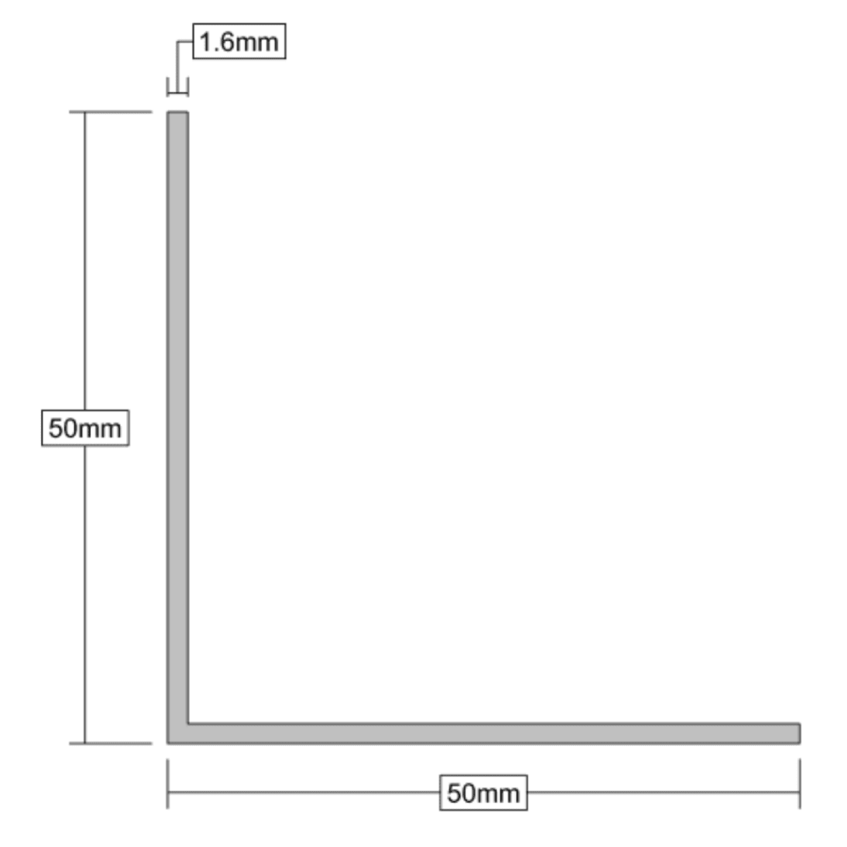 Aluminium Angle Edging in mill aluminium. Available in sizes 12 x 12 x 1.6mm, 19 x 19 x 1.6mm, 25 x 25 x 1.6mm, 32 x 32 x 1.6mm, 32 x 32 x 1.6mm, 38 x 38 x 1.6mm and 50 x 50 x 1.6mm.