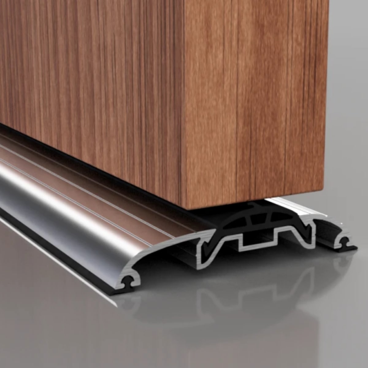 SG100 low profile threshold suitable for both inward and outward opening doors with centre rubber seal. Designed to fit onto a subsill or finished floor level. Seals under door gaps of 15-18mm. Ideally suited for doors that are protected from severe weathering. Available in sizes 1000mm, 1219mm, 1828mm in mill finish aluminium and 1828mm in gold effect finish aluminium.