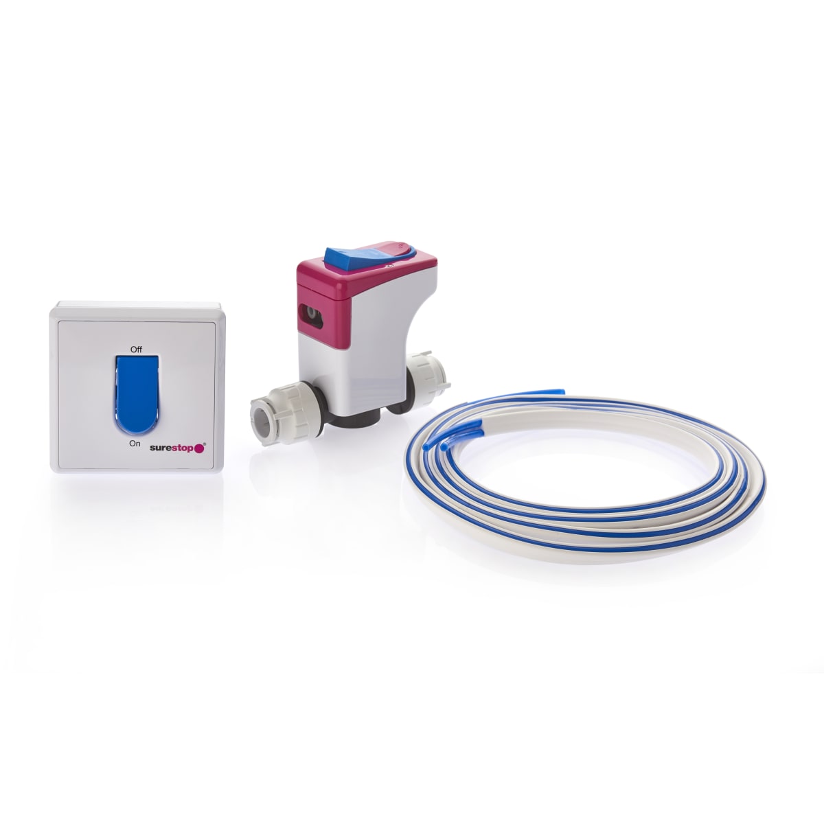 The Remote Stopcock 15mm (Dia) consists of a push button valve which is installed in the water supply as the water comes in to the property. It is connected by two meters of twin bore tubing to a switch. Located in a convenient position of your choice, such as inside a kitchen cupboard or above the worktop. Simply press the switch to turn the water supply on or off.