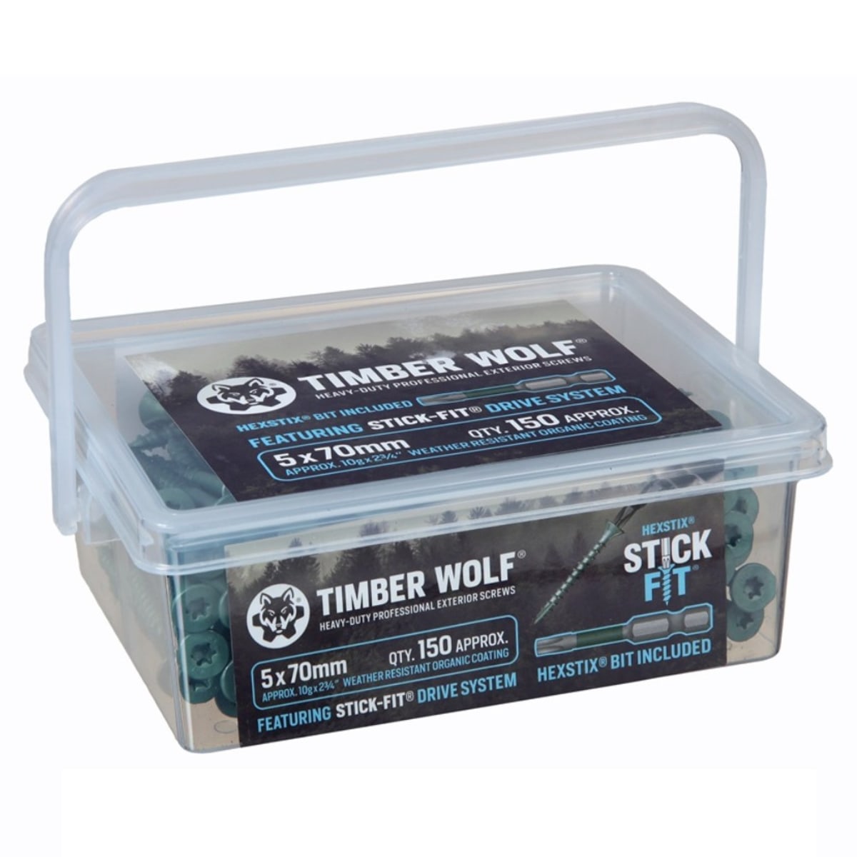 Timber Wolf exterior woodscrews are trade quality, high-performance woodscrews suitable for a wide range of outdoor applications. The screws feature the patented HEXSTIX Stick-Fit drive system that enables stable, wobble-free driving and one-handed installation. A high-quality Stick-Fit driver bit is included in every tub of Timber Wolf exterior woodscrews. The screws are also 100% compatible with standard T25 driver bits.