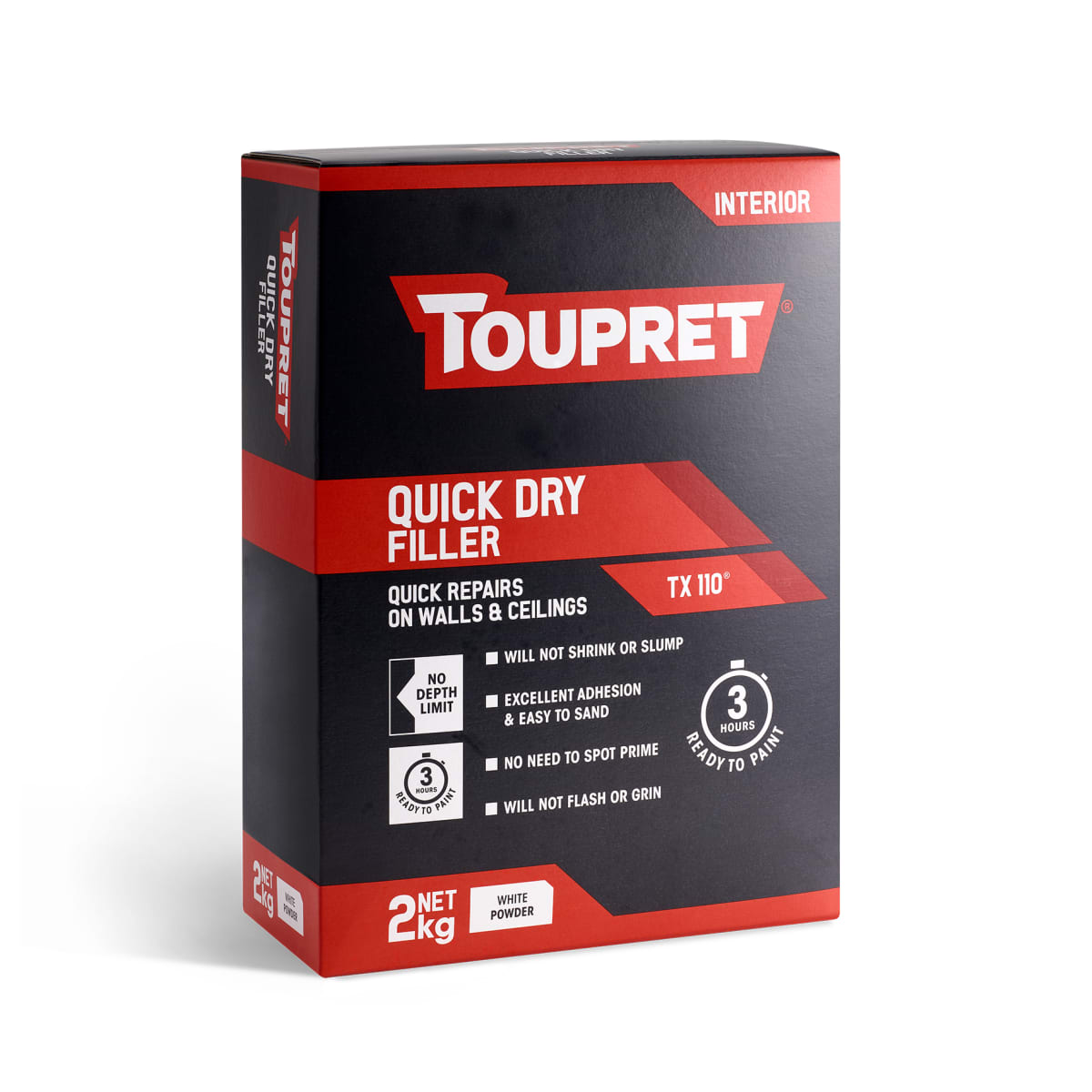 TOUPRET Quick Dry Filler for interior surfaces can be overcoated in 3 hours with any conventional paint or wallpaper. It can be filled to any depth without shrinking and offers exceptional adhesion with excellent shaping qualities. It's easy to sand and it won't flash or grin, so there's no need to spot prime. Can be used on new or renovated substrates, either unpainted or painted: gypsum plaster, plasterboards, old painted surfaces, cement, concrete, cellular concrete, breeze blocks, bricks and stone. Do not overcoat with polyurethane or solvent-based epoxy paints.