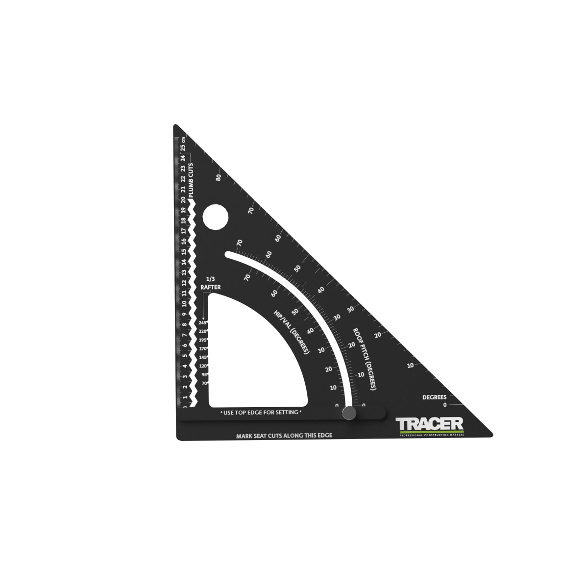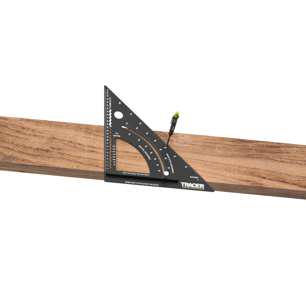 The TRACER 12'' ProSquare is an adjustable square tool with a lockable arm that allows for consistent markings time and time again. It is the quick and simplest tool for marking out com, jack, hip, and valley cuts.