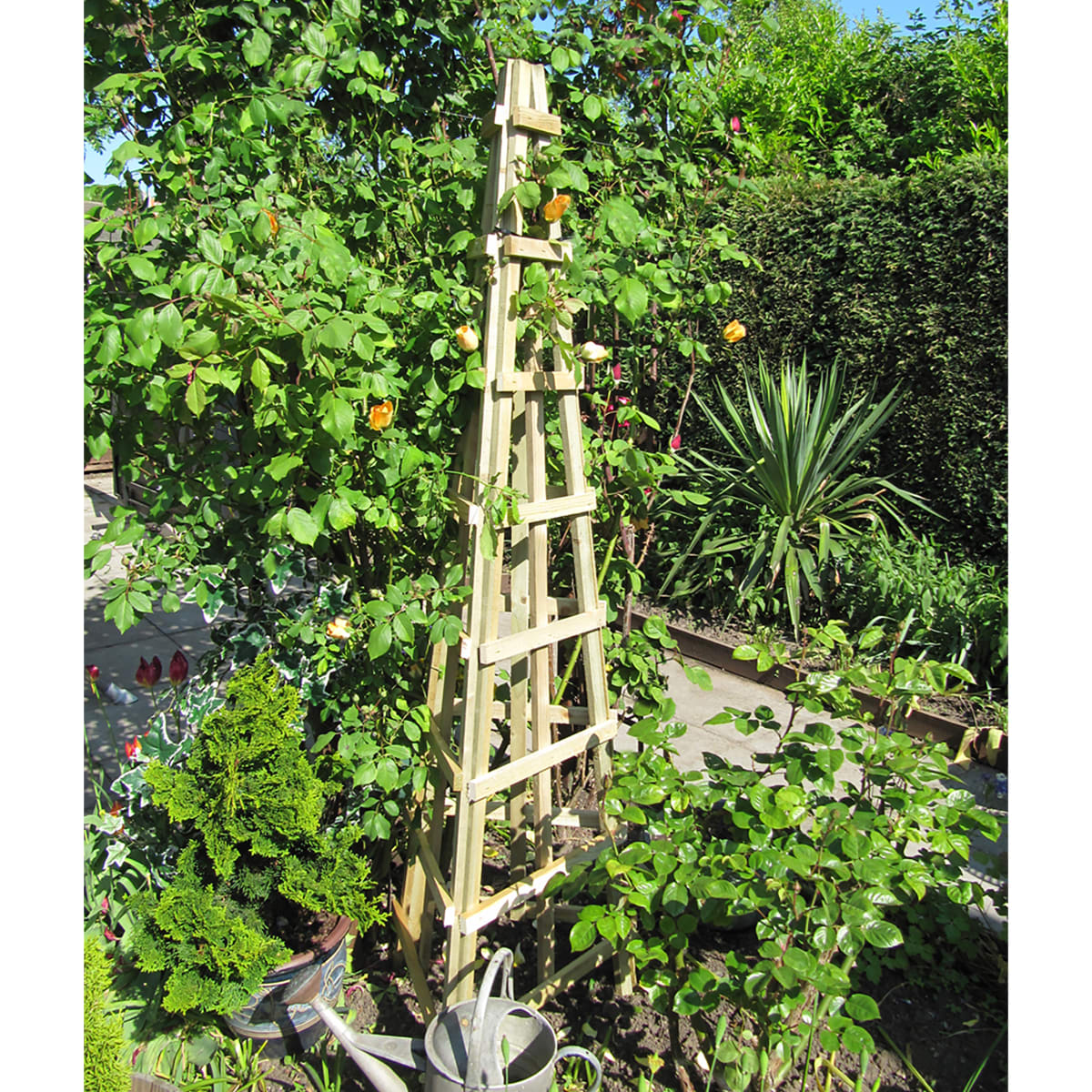 This three-sided trellis is perfect for growing runner beans or other climbing plants, adding height to gardens or borders.