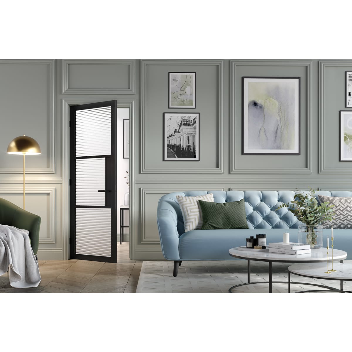 An amazing modern and industrial design with a retro twist. Featuring three generous reeded glazed panels, this door is ideal to let natural light flow throughout the home whilst also preserving the privacy. The textured glazing is shaped into semi-cylindrical adjacent mouldings to create the reeded pattern. The first door to use reeded glazing, this will be a stand out asset to the home. This internal door is constructed using sleek and slender primed plus black beading and a decorative lock block which is perfect for the matching accessories.