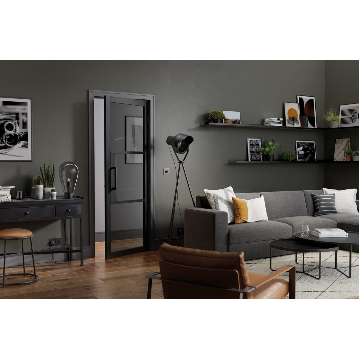 A cool and unique internal door, the Tribeca features Primed Plus Black decorative beading and an appealing solid lock block which is perfect for the matching accessories. This door is benefited from three generous glazed panels. Using tinted glazing, it makes the internal door a standout feature and will give the home the brightness it needs whilst still preserving a touch of the privacy. The Tribeca is the door you need for the modern home.
