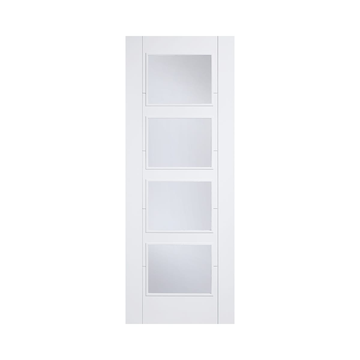 Four large clear glazed panels are positioned between decorative vertical grooves, with raised moulding and primed semi solid core in white. NB: FD30's supplied Solid Core