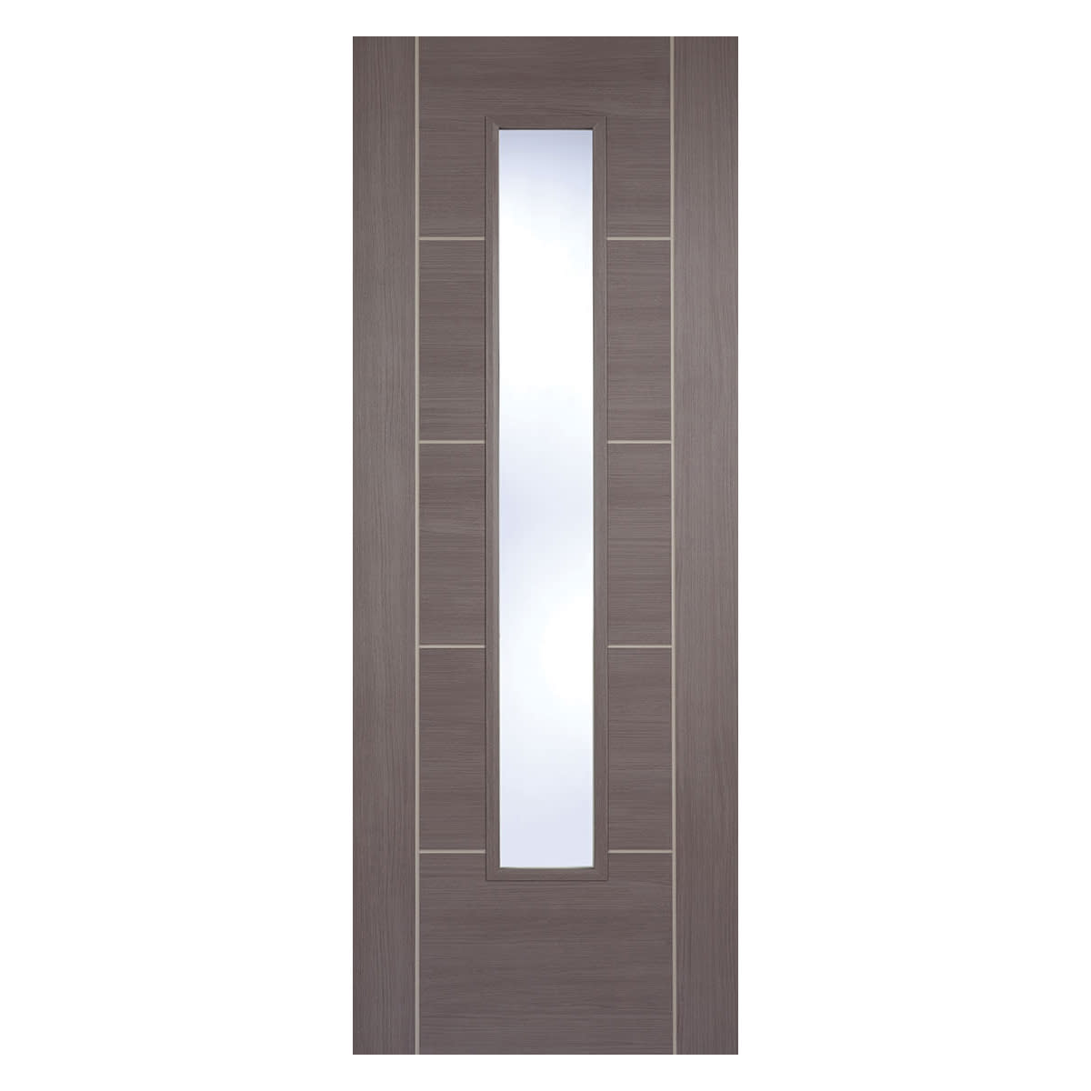 The sought after five panel, Vancouver design, this time in a medium grey, laminated finish with a slim, vertical clear glazed panel. NB: Standard doors supplied semi solid core.