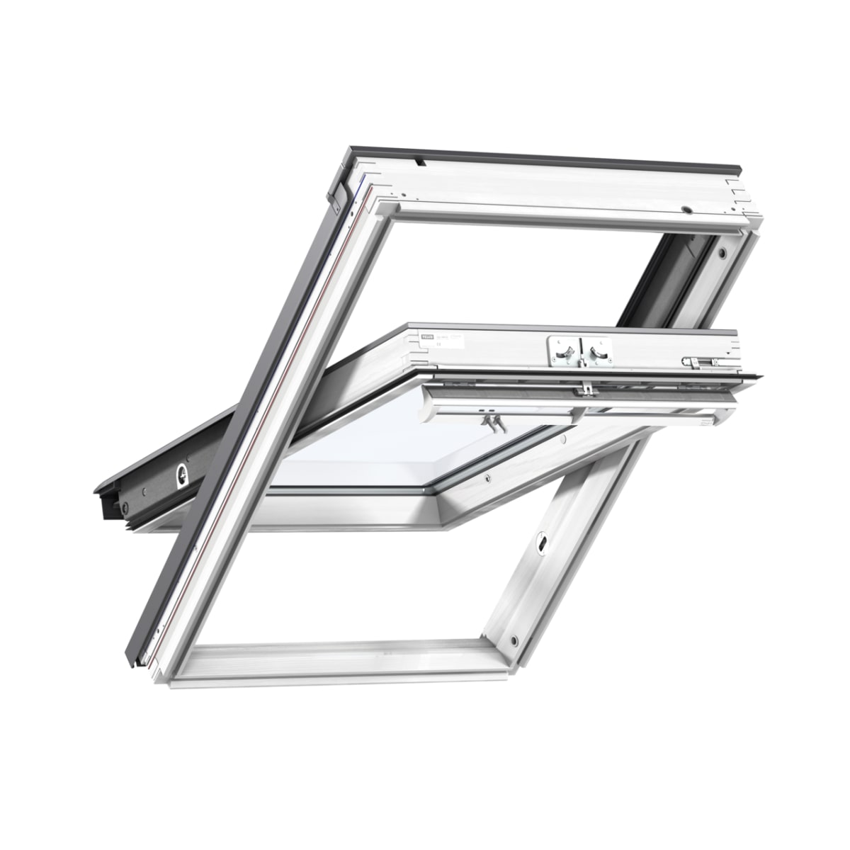 VELUX Centre Pivot roof Window 118 x 78cm (H x W) White is a range of centre pivot windows. Coated with a water-based lacquer. The roof windows have grey aluminium exterior covers as standard. Suitable for furniture that lies beneath the roof window. The window comes with a range of internal and external blinds. The product is fixed in roof pitches between 15 and 90 degrees.