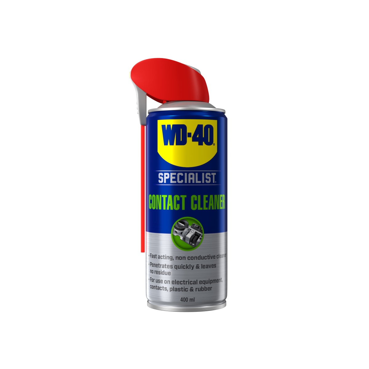 WD-40 Specialist Contact Cleaner Aerosol 400ml quickly penetrates its way into hard to reach areas. The smart straw application is done by holding upright and spraying directly onto the component. Suitable for use on electrical equipment, plastic and rubber.