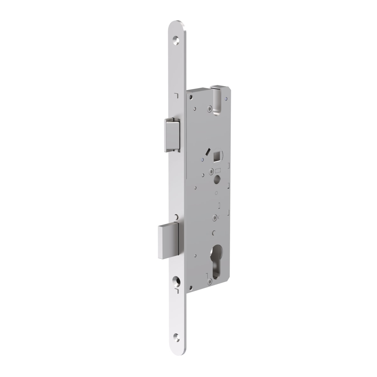 The mortise lock is an easy-to-install alternative e.g. for side entrance doors made of wood, PVC-U or aluminium with low security requirements. It contains the latch and the main deadbolt and is similar to a Winkhaus multi-point locking system in terms of routing, backset and rosette holes. The mortise locks can also be used with the standard latch deadbolt keeps from the Winkhaus range of frame parts.