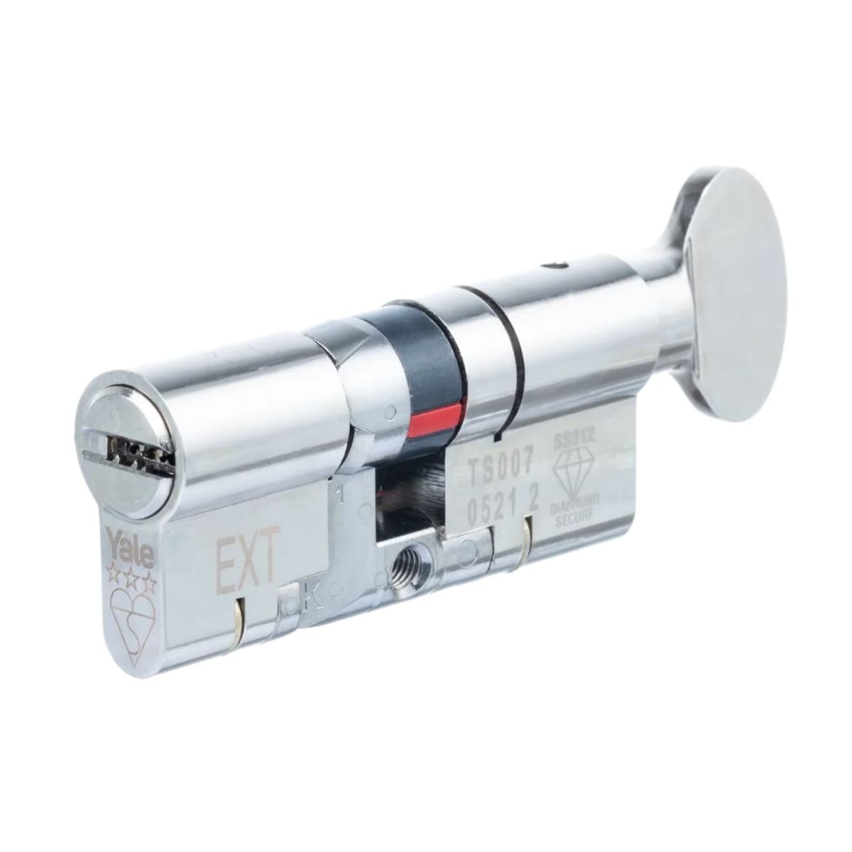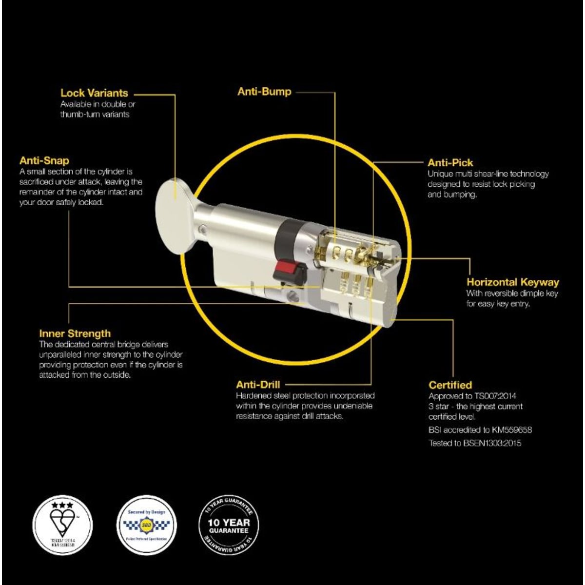 Yale Platinum 3 Star Thumbturn 80mm L Nickel Plated is a high key security lock with euro profile cylinder. Meets the requirement of highest current rating TS007:2014. Anti snap feature provides additional security against cylinder attacks. The knob is twisted to lock and unlock from inside.